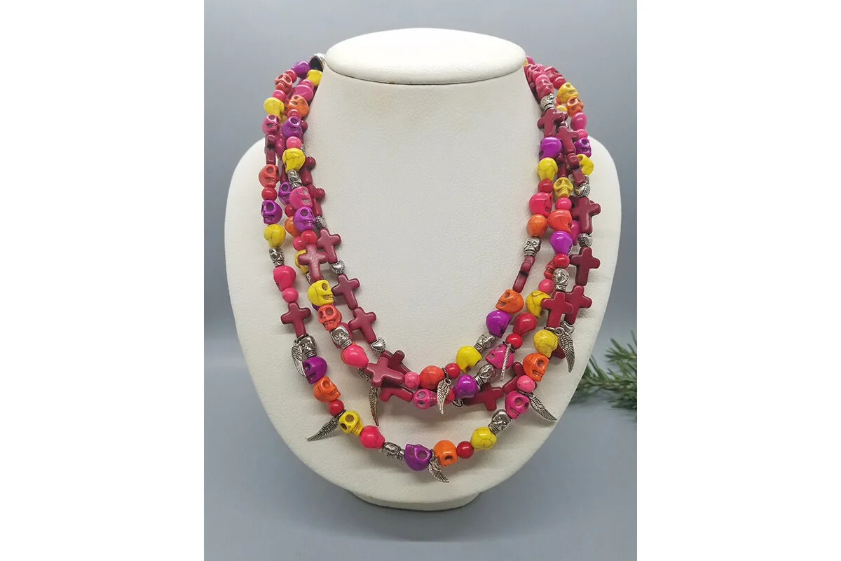 This 4-strand necklace is made of red, yellow, orange, pink, and fuschia magnesite stone beads in the shape of crosses and skulls combined with accents of silver tone beads and wings.