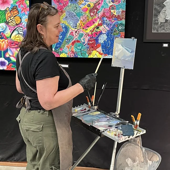 Folks who share an interest in painting and other media, meet once a week, currently on Mondays, to set up in a different space and support each other.